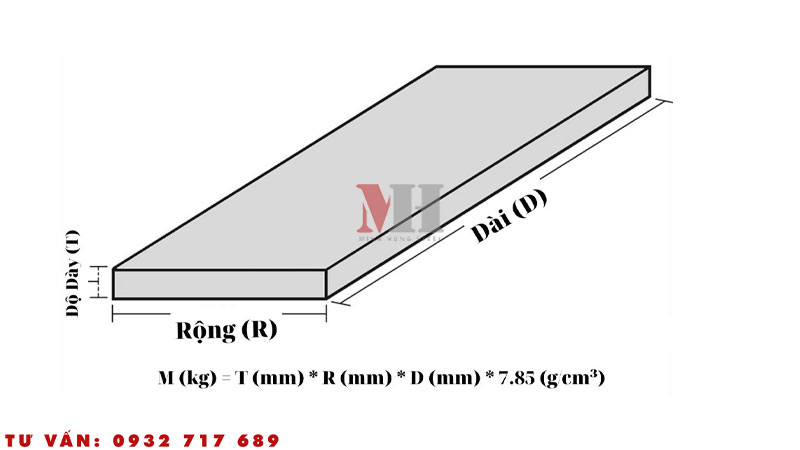 Trọng lượng (kg) = Chiều dài (m) × Chiều rộng (m) × Độ dày (m) × Tỷ trọng thép (kg/m³)