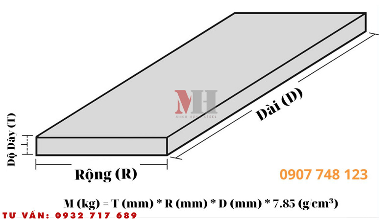 Công thức chuẩn: Trọng lượng (kg) = Chiều dài (m) × Chiều rộng (m) × Độ dày (m) × Tỷ trọng thép (kg/m³)